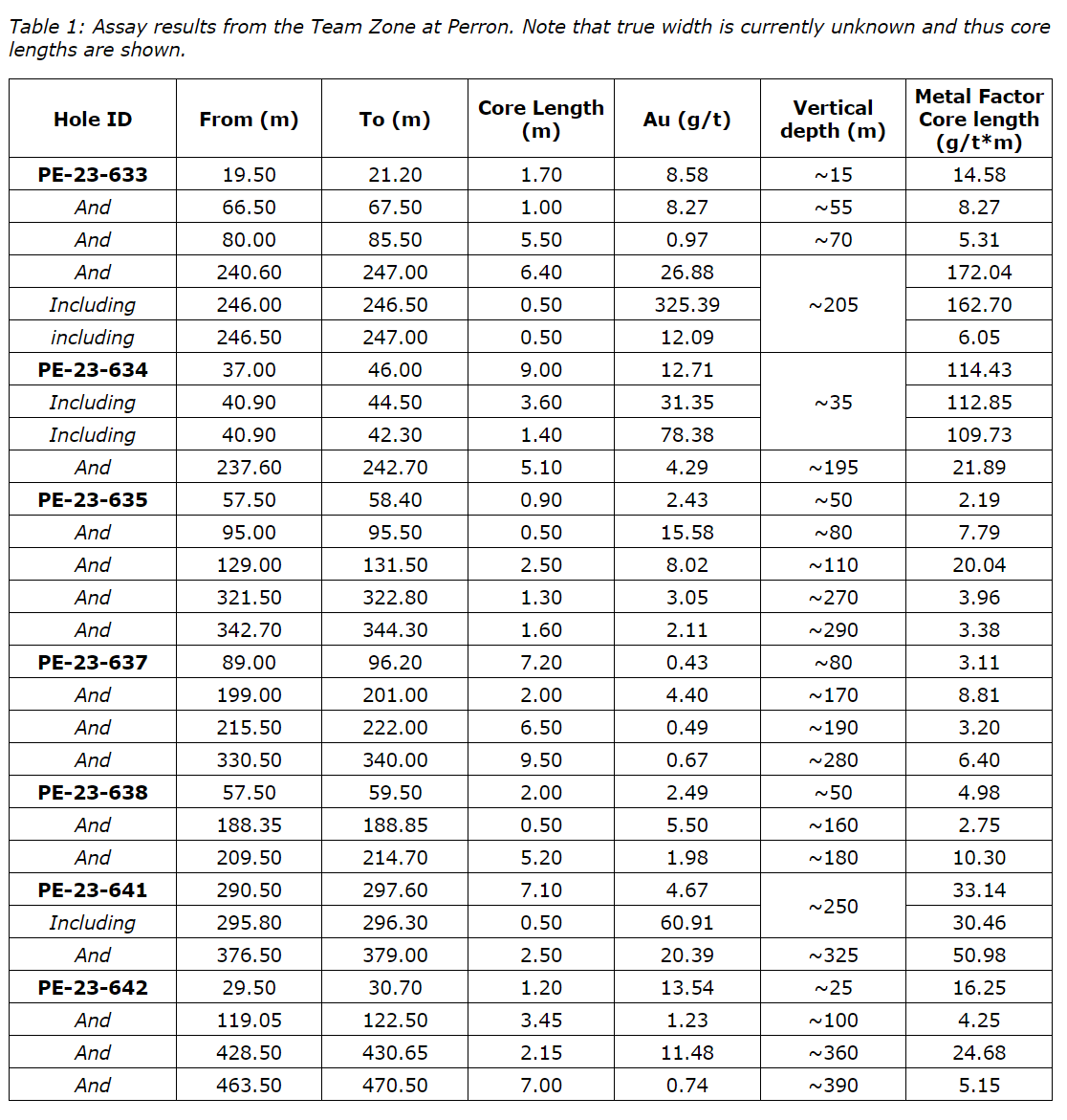 - PE-23-634: 12.71 grams per tonne gold over 9.00 metres, including 78.38 grams per tonne gold over 1.40 metres, at a vertical depth of approximately 35 metres and 4.29 grams per tonne gold over 5.10 metres, at a vertical depth of approximately 195 metres;