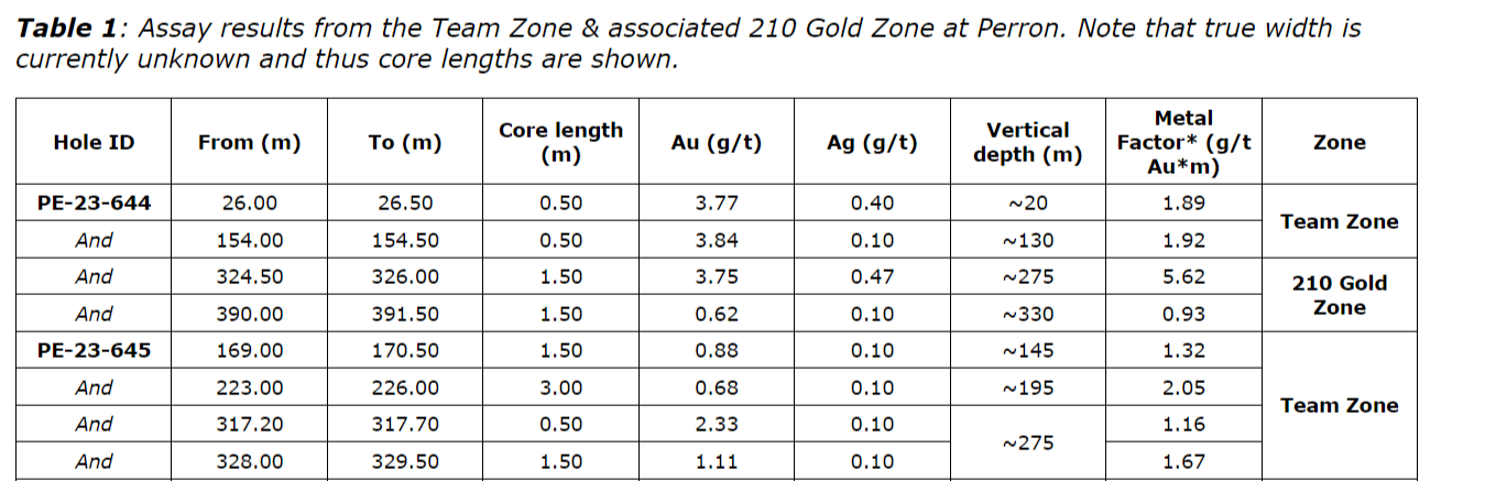 The Team zone sits within the Beaupre rhyolite, host to all significant gold occurrences at Perron, at the contact of the Normetal fault and approximately 600 m northeast of the high-grade zone. Gold mineralization occurs within a relatively massive and silicified rhyolite host rock, within quartz-carbonate veins/veinlets containing sphalerite, pyrite, minor chalcopyrite, molybdenite and visible gold. Gold mineralization is also disseminated within the rhyolite host rock, in contrast with several other zones identified on the project to date. Amex is currently conducting 50 m spaced (three dimensionally) definition drilling of this system from surface to a depth of approximately 450 m vertically. Today's results are a part of the continuing definition drilling program. The associated 210 gold zone results presented occur within the same drill holes that targeted the Team zone. This is quite encouraging, as the two closely located zones have the potential to be a part of the same gold system or mineralizing event. Note that the 210 gold zone intercept true widths and vein orientations are unknown, and further drilling optimization is required in order to define and understand this part of the system.