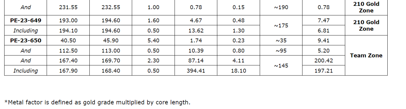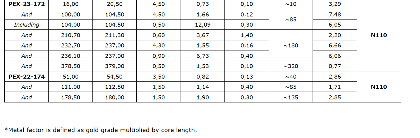 The N110 gold corridor was identified through a structural interpretation of the company's magnetic data set and scattered gold intercepts, including 3.18 g/t Au over 4.50 m in hole PEX-21-054 and 2.56 g/t Au over 3.30 m in hole PEX-21-065. The N110 mineralization is characterized by numerous veins and veinlets that occur within massive silicified Beaupre rhyolite. The majority of the holes targeting this corridor have intercepted visible gold mineralization, which is encouraging as it indicates a very fertile mineralizing fluid. The company is conducting a review of the data and drill core, with an aim to test for high-grade-zone-type ore shoots within this widespread area of visible gold mineralization.