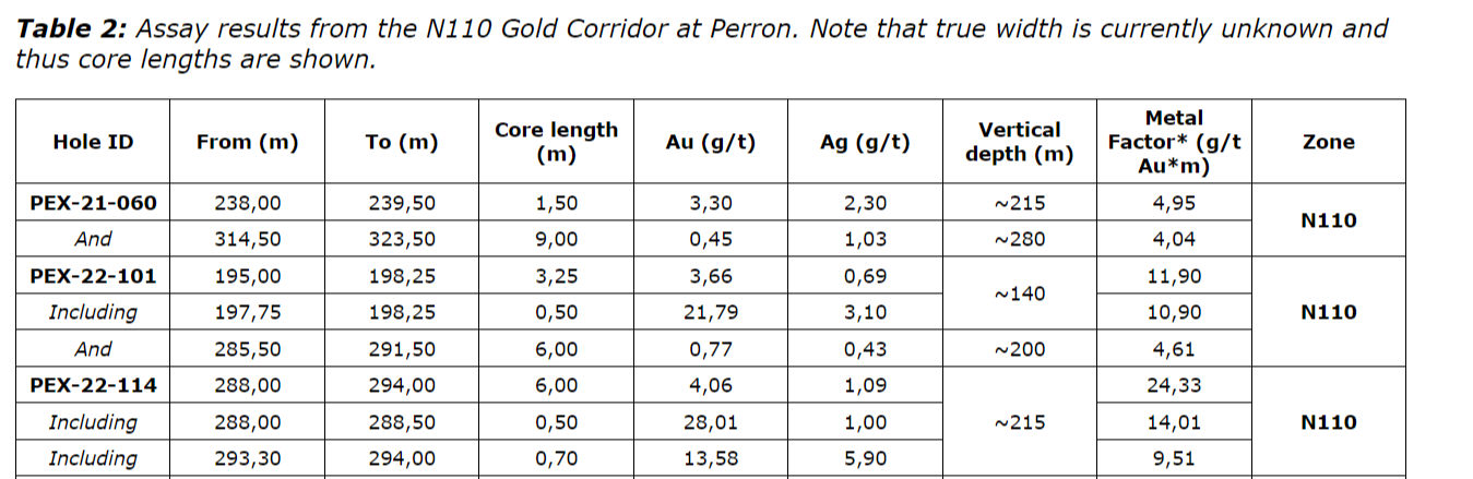 In addition, Amex has released assay results from the newly discovered N110 gold corridor, which is located north of the Gratien gold zone, and the eastern extents of the property along the projected extension of the Beaupre rhyolite, which is the host to the majority of the gold identified on the Perron project to date (see an attached table for a list of drill results). The N110 gold corridor was identified through a structural interpretation of the company's magnetic data set and scattered historical gold intercepts.
