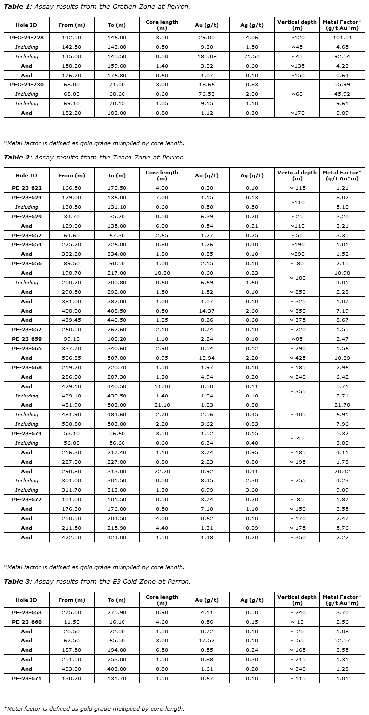- PEG-24-728 returned 3.50 m of 29.00 g/t Au, including 0.50 m of 185.08 g/t Au at a vertical depth of ~120 m in the Gratien Gold Zone;