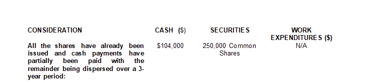 Upon acquiring a 100-per-cent interest in the properties, the company will grant the optionors a 1.5-per-cent net smelter return royalty on the properties, one-third of which may be repurchased by the company for $1-million to reduce the royalty to a 1.0-per-cent net smelter return royalty.