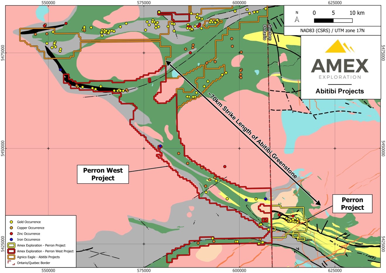 Figure 1: Geological map of Amex's land holdings in the Abitibi Greenstone Belt totalling 570.94km2, including the flagship Perron Project in Québec and the Perron West Project in Ontario
