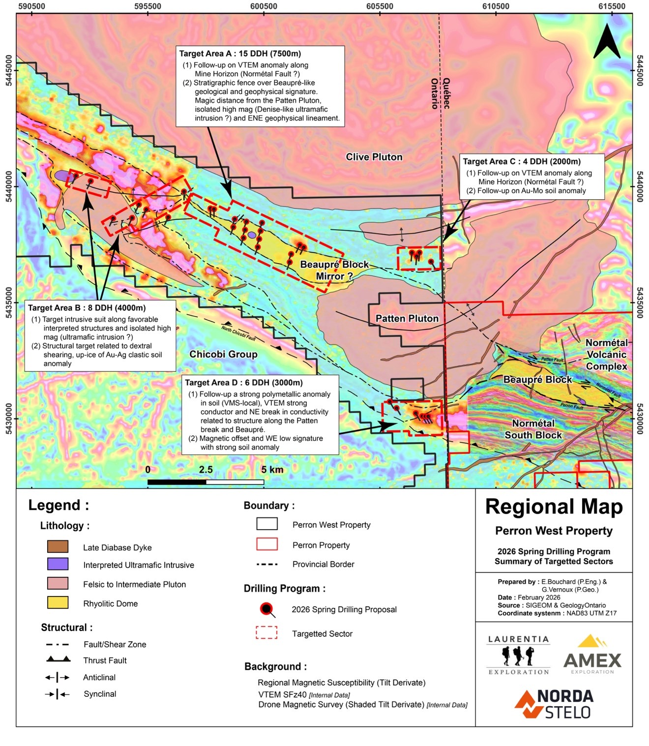 Figure 2: Details of Amex's initial 15,000 m drill program for Perron West in Ontario. Planned drill holes and certain geological units overlay an electromagnetic survey in Ontario and drone magnetics survey in Quebec. The potential Beaupré Block mirror image is highlighted in yellow.