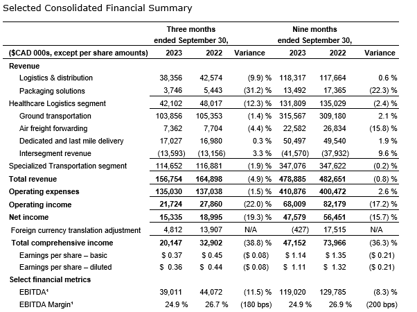 Revenue for Q3 2023 decreased by 4.9 per cent to $156.8-million, compared with $164.9-million in Q3 2022. The decrease is primarily attributable to lower fuel surcharge revenue, a decline in United States-based truckload rates and reduced revenue related to COVID-19 vaccines and ancillary products. The company's COVID-19-related revenue declined to approximately 0.8 per cent of consolidated revenue in Q3 2023, compared with approximately 2.8 per cent of revenue in Q3 2022.
