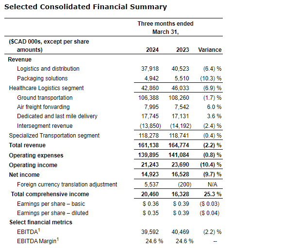 Consolidated revenue for Q1 2024 decreased by 2.2 per cent to $161.1-million, compared with $164.8-million in Q1 2023. The decrease was primarily attributable to lower revenue in the company's United States-based truckload business (Boyle Transportation and Skelton USA) and Accuristix, and lower fuel surcharge revenue, partially offset by organic growth in the company's Canadian specialized transportation product lines, excluding fuel surcharge revenue.