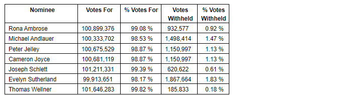 All of the nominees listed in the management information circular prepared in connection with the meeting were elected as directors of the company. The company received proxies and virtual votes at the meeting as set out in the attached table.