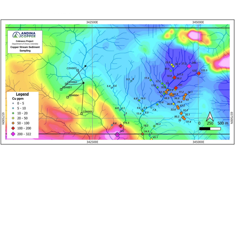 – TheNewswire - Vancouver, British Columbia - Andina Copper Corporation (TSX-V: ANDC | FSE: FIR | OTCQB: PMMCF) is pleased to provide an update on its ongoing field exploration activities at the Cobrasco copper project located in the Chocó Department, Colombia.