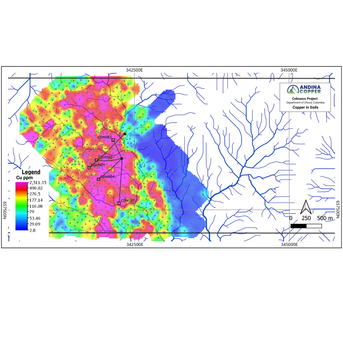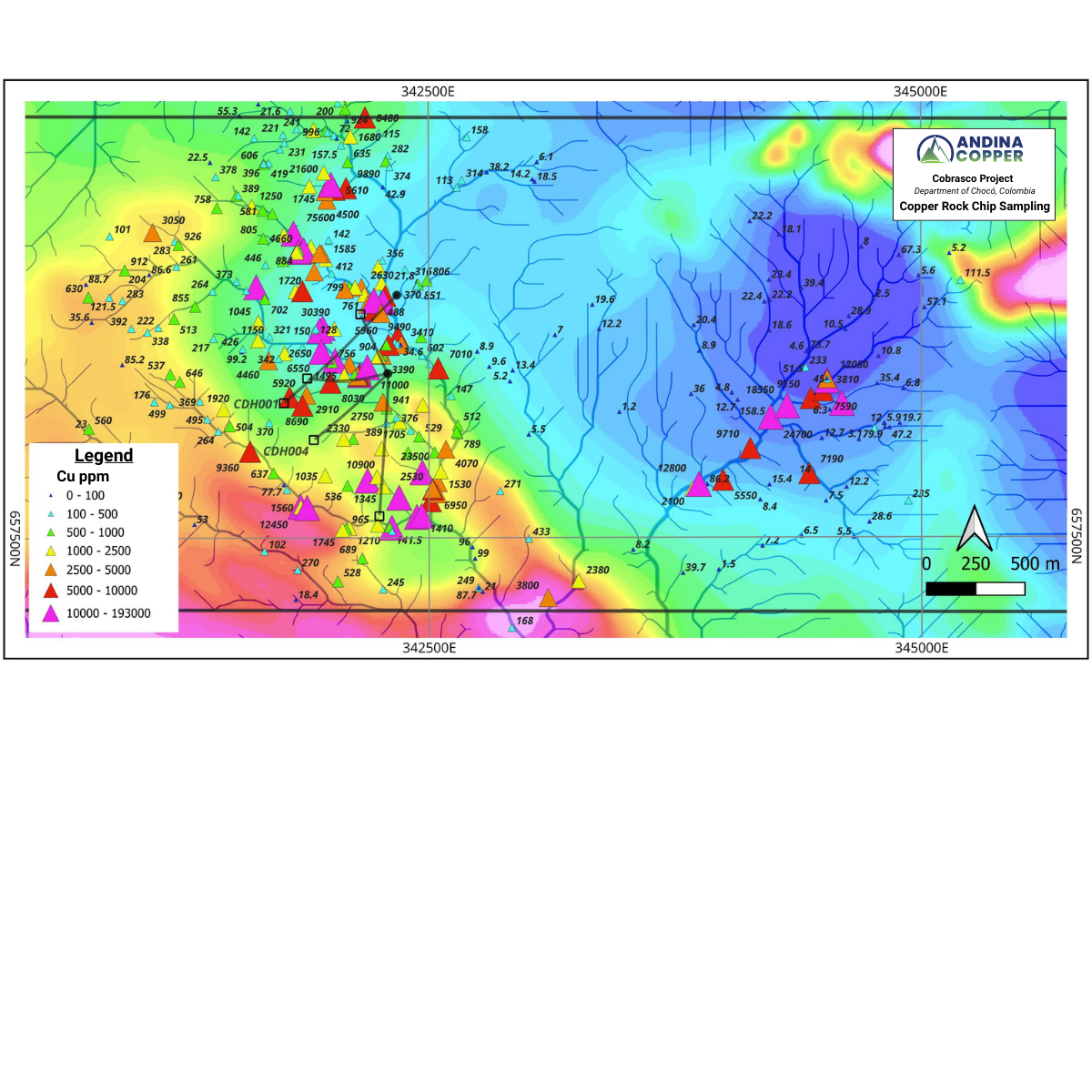 Figures 1, 2 and 3 show the results of recent stream sediment sampling, rock chip geochemical sampling and grid-based soil (auger) geochemistry completed over the northern Cobrasco block.