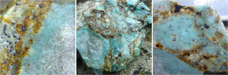 Fig 1 – Copper mineralized float samples from the Cobrasco East occurrence. Clast-supported breccia samples shown, with chalcocite-bornite-chalcopyrite locally in matrix, with the oxidation of these minerals generating a secondary Cu-oxide halo