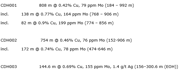 Hole CDH003 was originally drilled to 300.60 m by Rugby Resources and intersected 144.6 m of 0.69 per cent Cu, 155 ppm Mo and 1.4 g/t Ag from 156 to end of hole. The last 2.6 m ended in 2.69 per cent Cu, 151 ppm Mo and 7.3 g/t Ag (refer to Feb. 9, 2023, news release -- Rugby Resources).
