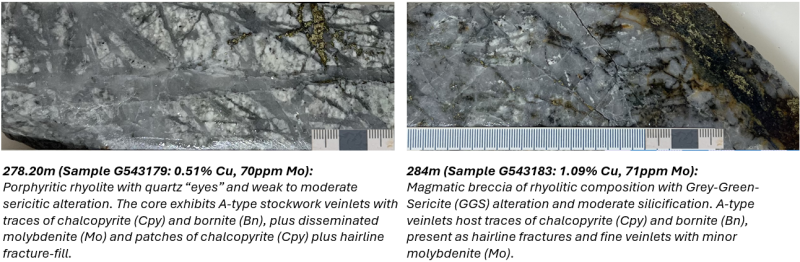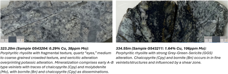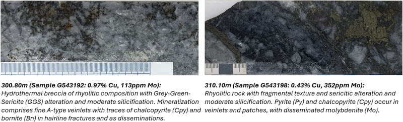 Mineralization observed in CDH007 is broadly consistent with that intersected in CDH006 and is dominated by chalcopyrite hosted within structurally prepared zones, including strong argillic alteration in near-surface saprolite and clay-rich fault gouge, transitioning to phyllic and grey-green sericite (GGS) alteration in more competent core intervals, with bornite occurring sporadically as disseminations and as rims to chalcopyrite mineralization.