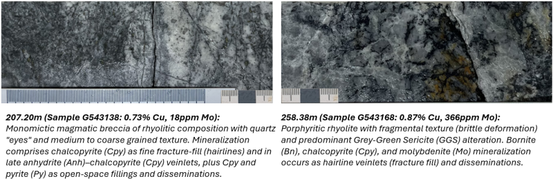 Drillholes completed to date demonstrate a potentially world-class copper porphyry complex, comprising multiple intrusive phases, subvolcanic flow-domes and mineralization events occurring at (or near) surface.