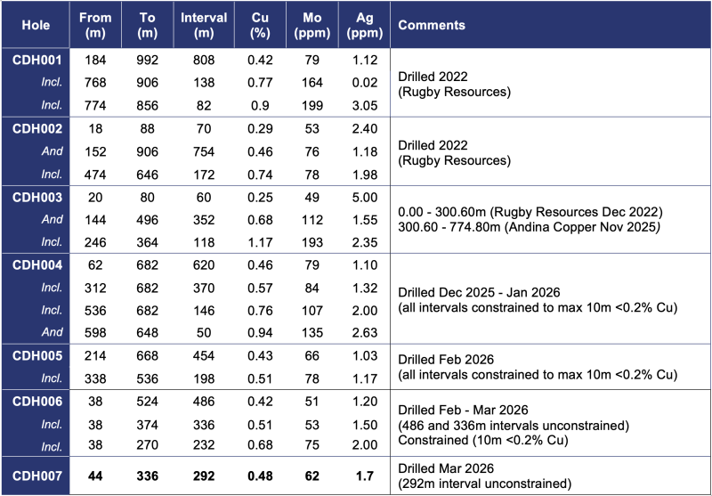 Following the high-grade Cu-Mo intersections reported in recent drillholes CDH003 to CDH005 ( refer March 24, 2026 News Release ), a new step-out drill pad was collared to test the continuity and extension of the Cobrasco Central mineralized system to the northwest. Drillhole CDH006 was drilled to the southwest along this new section line intersecting 232m @ 0.68% Cu, 75ppm Mo, 2 g/t Ag from 38m ( refer April 14, 2026 News Release ). Hole CDH007 was drilled from the same pad to the northeast, in a section line parallel to previous holes CDH001 and CDH004.