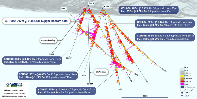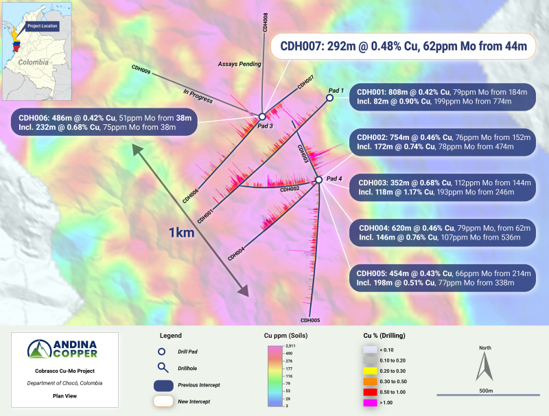 April 21, 2026 – TheNewswire - Vancouver, British Columbia. Andina Copper Corporation (TSX-V: ANDC | FSE: FIR | OTCQB: PMMCF) is pleased to report an outstanding drill intercept from CDH007, the second hole completed from a new step-out drill pad at the Cobrasco Project in Chocó, Colombia.