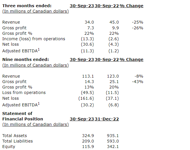 Net loss of $30.6-million decreased 616 per cent, or $26.3-million, compared with the same period in fiscal 2022 (Q3 2022: net loss of $4.3-million). The decrease was mainly driven by an impairment loss recorded for Fibracast, losses in equity accounted investees and finance costs related to increased lending activity.