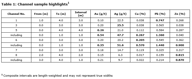 The channel program returned consistent base and precious metal values across multiple cuts, confirming that mineralization is continuous over several metres at surface. The strongest intervals include up to 1.44 per cent Pb, 0.90 per cent Zn, 0.57 per cent Cu, 0.35 g/t Au and 51.6 g/t Ag, as well as 1.36 per cent Pb, 0.04 per cent Zn, 0.27 per cent Cu, 0.54 g/t Au and 47.7 g/t Ag over 1.0 metre within broader polymetallic zones ranging from three to four metres wide. These results demonstrate that the MMZ hosts significant near-surface mineralization with strong potential for lateral continuity.