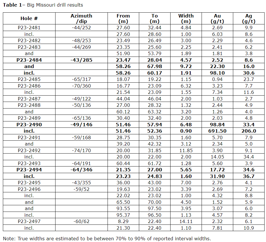 Drilling for the 2023 exploration season at the Big Missouri deposit was conducted from early August until this past week, during which time 72 holes were drilled from surface for a total of 6,539 metres. The initial batch of assay results in this release contains the first 17 holes, totalling 1,246 metres, drilled from pads 23-BM1 and 23-BM2, that were aimed at stopes to the north of the S-1 pit at the Big Missouri deposit. The drill holes targeted stope shapes for additional pierce points, gaps between stopes due to previous drill patterns, and extensions along strike and up dip. A summary of assay results is shown in the table entitled "Big Missouri drill results."