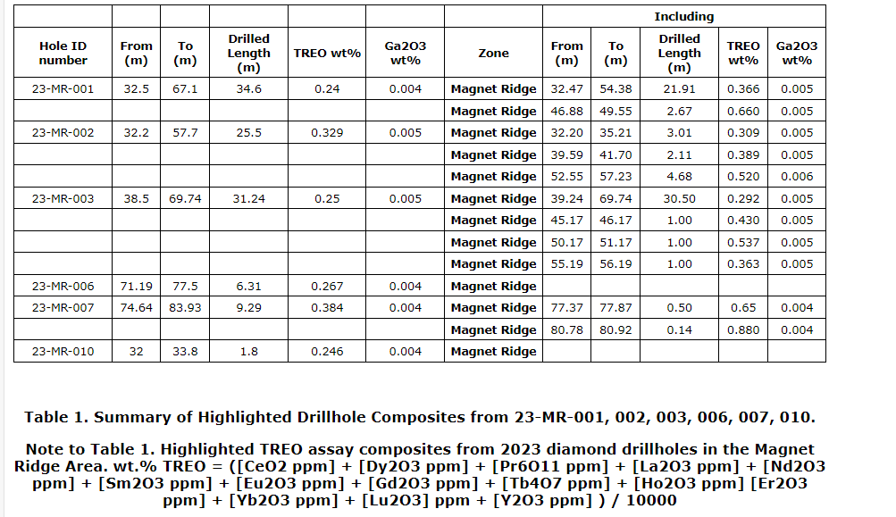 - Hole 23-MR-001: 21.91 metres width at 0.366 weight per cent TREO, including 2.67 m at 0.660 weight per cent TREO;