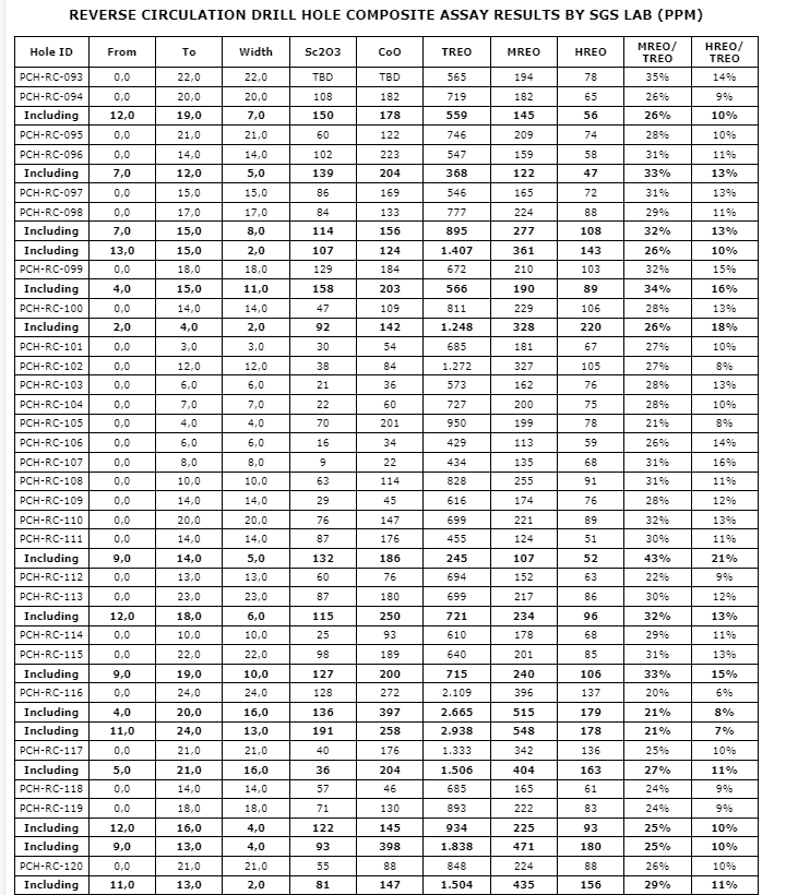 Stephen Burega, president, stated: "There is significant potential in this newly identified REE mineralized zone. While the Buriti zone has a completely different geological setting from the Target IV alkaline breccia to the north, we continue to see impressive REE results with the addition of significant scandium and cobalt values within the same drill holes. Drill holes PCH-RC-116 and PCH-RC-130, both remaining open at depth, highlight this potential. As previously reported, a standout among the analyses is hole PCH-RC-116, exhibiting mineralization averaging 2,109 ppm TREO, 272 ppm CoO and 128 ppm Sc2O3 to a depth of 24 metres from surface."