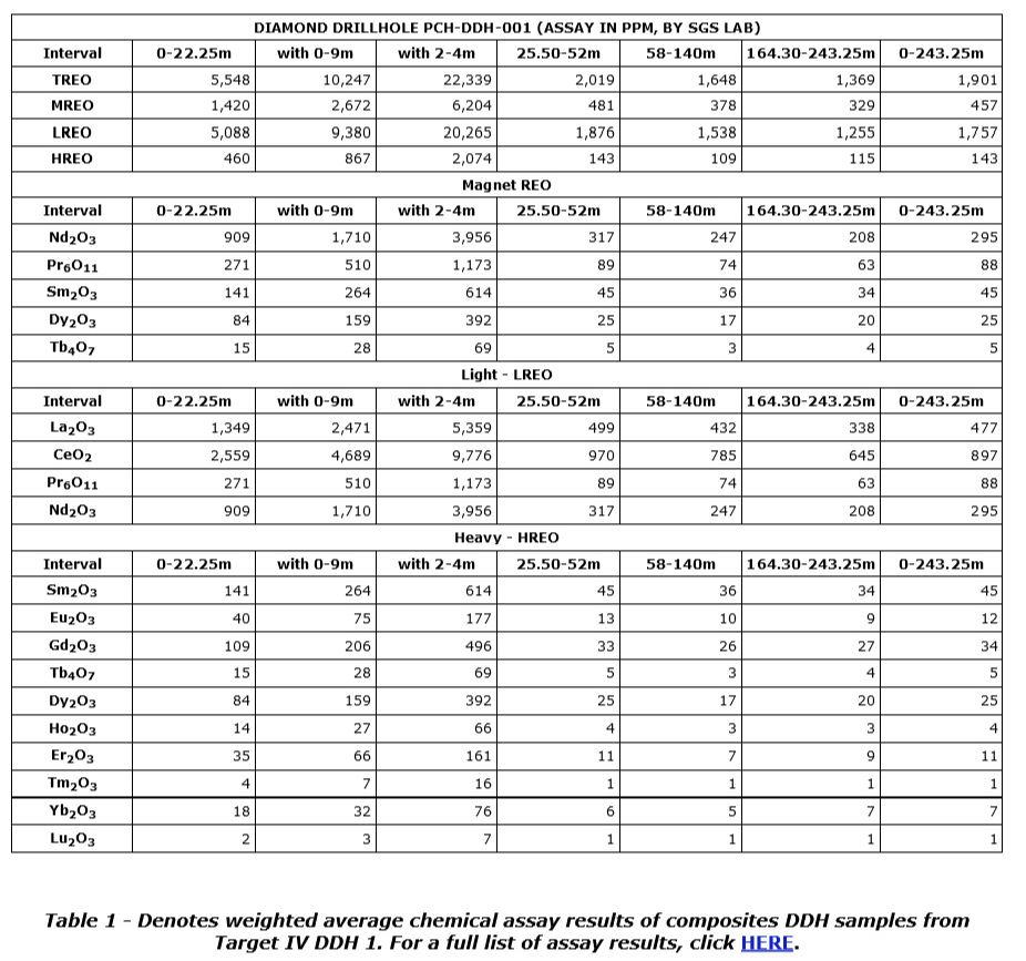 Stephen Burega, president, commented: "The findings from the ionic clay and saprolite weathered profile on PCH-DDH-001 underscore the exceptional potential of the target zone. The weathered profile along the hole extended to approximately 20 metres of true thickness yielding concentrations of 5,548 ppm [parts per million] or 0.55 per cent total rare earth oxide (TREO), 1,420 ppm or 0.14 per cent magnet rare earth oxide (MREO). The results confirm the ultrahigh-grade nature of the upper levels, including concentrations reaching up to 22,339 ppm or 2.23 per cent TREO, 6,204 ppm or 0.62 per cent MREO, and 2,074 ppm or 0.21 per cent heavy rare earth oxide (HREO) across two metres from a depth of two m to four m."