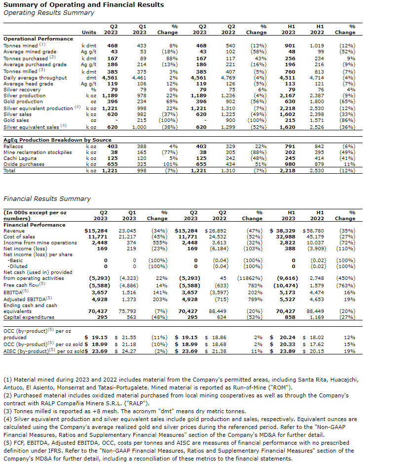 - The company is reaffirming its full-year 2023 production guidance of 4.8 million to 5.2 million AgEq oz. During H2 2023, the company will continue to process material from its surface deposits and from new material purchasing contracts, including the recently signed one with Bedrock for the Alta Vista deposit. Additionally, the company will continue to purchase material from community mining partners and explore opportunities to source additional feed from third parties and COMIBOL. As previously disclosed, approximately 54 per cent of 2023 production is expected in the second half of the year.