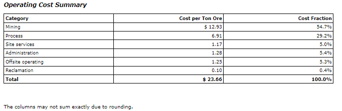 The operating costs are estimated to average $23.66 per ton, including mining, processing, G&A (general and administrative), and reclamation.