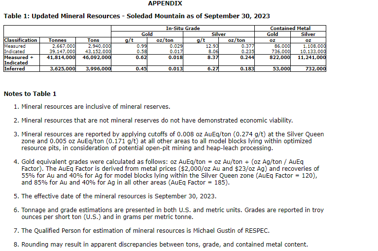 The estimates of mineral resources are effective as of Sept. 30, 2023, and are presented in appendix -- Table 1 of this press release.