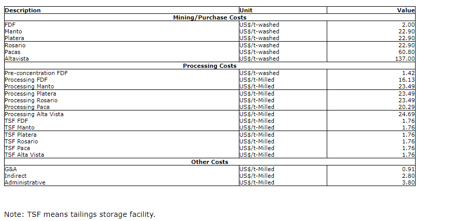 Operating costs were developed by Andean and are based on the production schedule and stated reserves. Cost estimation is based on requirements of equipment, operating labour, supervision, administrative labour, mine, process consumables, maintenance et cetera. The attached table summarizes the operating costs of the San Bartolome project.