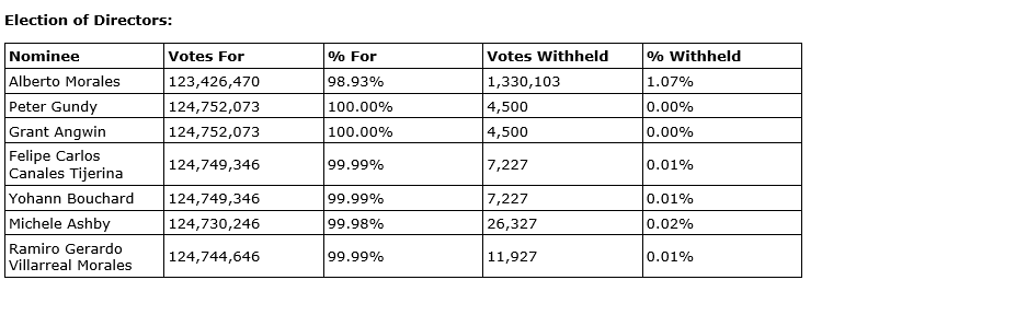 Andean Precious Metals Corp. has released the voting results from the company's annual general and special meeting of shareholders, held on Friday, June 27, 2025.