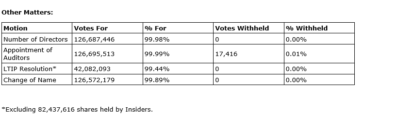 A total of 126,712,930 common shares were voted for at the meeting, being 85.74 per cent of the company's total issued and outstanding common shares. A majority of shareholders voted in favour of the management resolutions brought before the meeting.