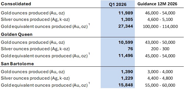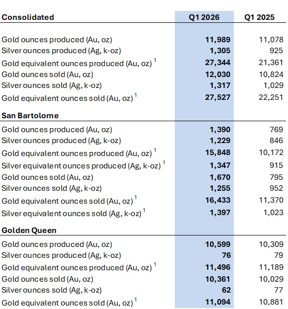 Alberto Morales, Executive Chairman and CEO, stated, "We are pleased with our start to 2026, with production up 28% year-over-year on a GEO basis, highlighted by a strong performance at San Bartolome, where higher throughput and a 25% increase in grades compared to the prior year drove a meaningful increase in production. While the first quarter is typically the slowest period of the year due to seasonal factors, performance this year exceeded our expectations and reflects the strength of our ore sourcing strategy. At Golden Queen, production tracked as expected, with improvements compared to the prior year period, reflecting solid underlying performance as we continue to advance our mine plan.