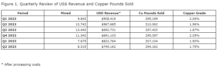 During Q2, 2023, the company extracted a total 8,315 tonnes of mineralized copper-gold material at Farellon. This represents an increase of 8 per cent from the 7,675 tonnes of material mined in Q1. Tonnes processed in Q2 represented 7,883 tonnes, an increase of 4 per cent from the previous quarter of 7,584 tonnes. The copper grade recovered was 1.75 per cent, down 13 per cent from the previous Q1 2023 result of 1.90 per cent. Waste removal increased by 400 per cent to 3,262 tonnes in Q2 2023 as development progressed to the 336-metre operational level. Sales of 294,162 pounds of copper in Q2 2023 generated approximately $422,815 (U.S.) in revenue (after processing costs), a decrease of 22 per cent over the Q1 2023 $539,300 (U.S.) sales figure.