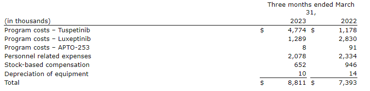 - Program costs for tuspetinib were $4.8-million for the three-month period ended March 31, 2023. The company in-licensed the development rights of tuspetinib in the fourth quarter of 2021 and assumed sponsorship, and the related costs, of the study effective Jan. 1, 2022. The higher program costs for tuspetinib in the current period represent the enrolment of patients in the company's Aptivate clinical trial, its healthy volunteer trial and related expenses.