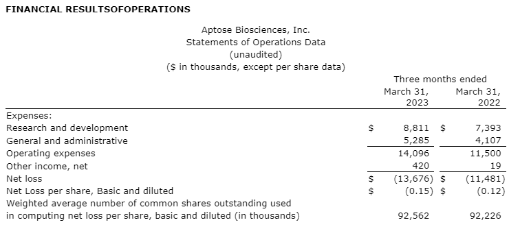 APTOSE REPORTS RESULTS FOR THE FIRST QUARTER 2023
