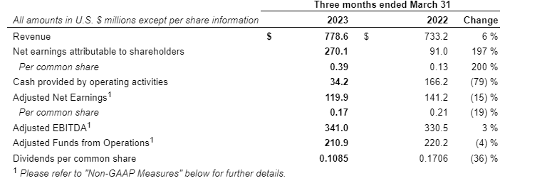Algonquin Power & Utilities Corp. has released financial results for the first quarter ended March 31, 2023. All amounts are shown in United States dollars, unless otherwise noted.