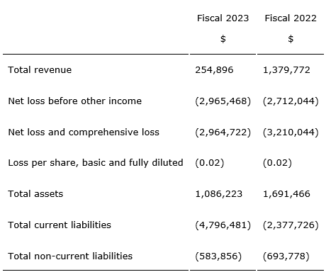 The company reported an operating loss before other income and expenses of $2,965,468 for fiscal 2023, an increase of 9 per cent from the loss before other income of $2,712,044 in the year ended Dec. 31, 2022. The higher loss was primarily due to lower revenue in fiscal 2023 relative to fiscal 2022. The lower revenue was offset by a reduction in expenses.