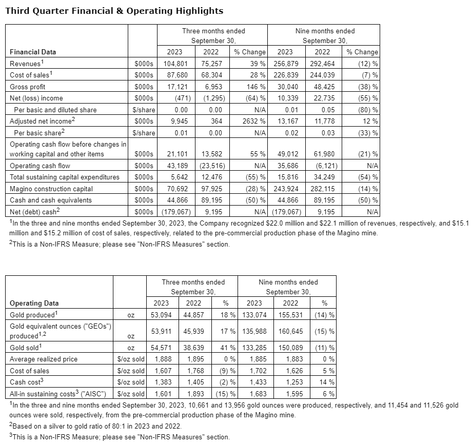 - During the three months ended Sept. 30, 2023, the Magino mine produced 10,661 gold ounces and sold 11,454 gold ounces. Production was lower than expected due to the unplanned downtime, the delay in completing and commissioning the gravity circuit, and lower feed grades.