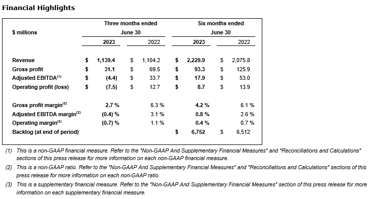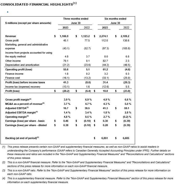 AECON REPORTS SECOND QUARTER 2023 RESULTS