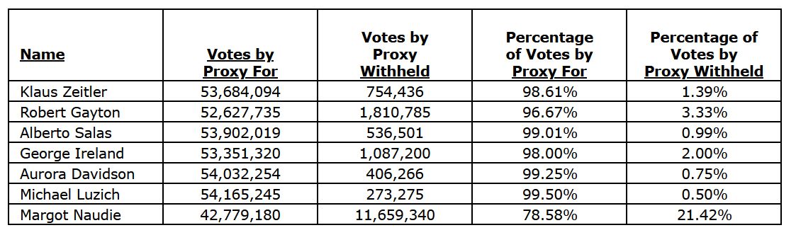 At the AGM, 74,669,441 common shares were voted, representing 44.84 per cent of the votes attached to all outstanding common shares of the company.
