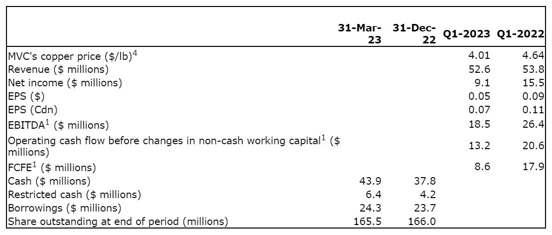 Net income during Q1-2023 was $9.1 million, a reduction of $6.4 million compared to the net income in Q1-2022 of $15.5 million due to lower copper revenue and higher production costs.