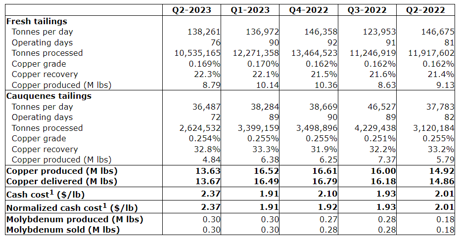In Q2 2023, MVC produced 13.6 million pounds (Mlb) of copper, with 65 per cent of production coming from fresh tailings. Copper production to the end of May, 2023, was trending 4 per cent over guidance. As a result of the lost production due to the climatic event, cumulative production to June 30, 2023, of 30.15 Mlb was 1.5 per cent below guidance. Amerigo's 2023 adjusted copper production guidance of 60.5 Mlb, reflecting the impact of the unexpected shutdown and announced to the market on June 30, 2023, remains in place.