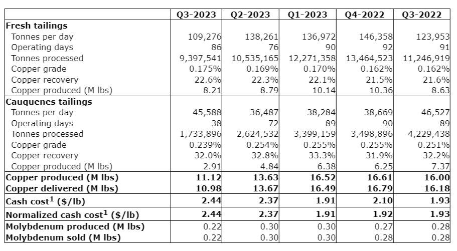 In Q3 2023, MVC produced 11.1 million pounds of copper, with 74 per cent of production coming from fresh tailings. Amerigo's total 2023 copper production is expected to exceed the revised annual guidance of 57.8 Mlb announced to the market on Sept. 11, 2023. This revised annual guidance incorporated the impact of the severe rains on MVC's Q2 2023 and Q3 2023 copper production.