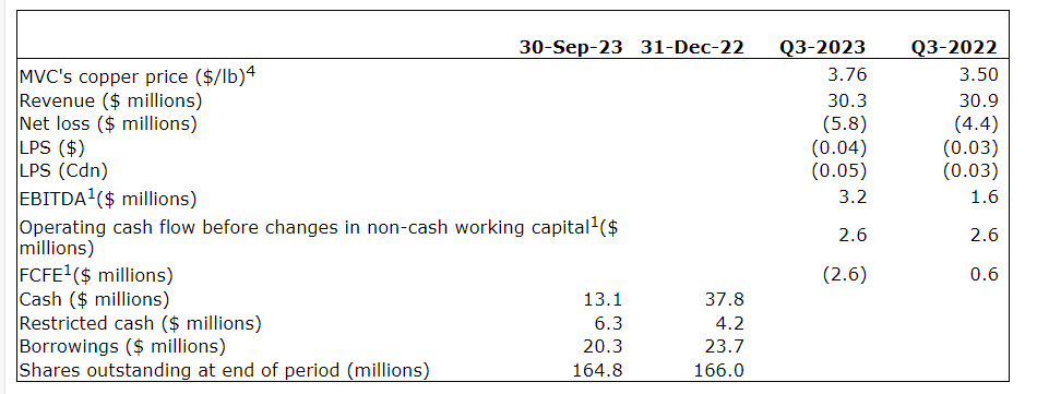 - Net loss during Q3 2023 was $5.8-million, compared with a net loss of $4.4-million in Q3 2022, primarily due to an increase of $1.4-million in unrealized foreign exchange loss and $1.1-million spent on environmental compliance plan costs which could not be capitalized under international financial reporting standards.