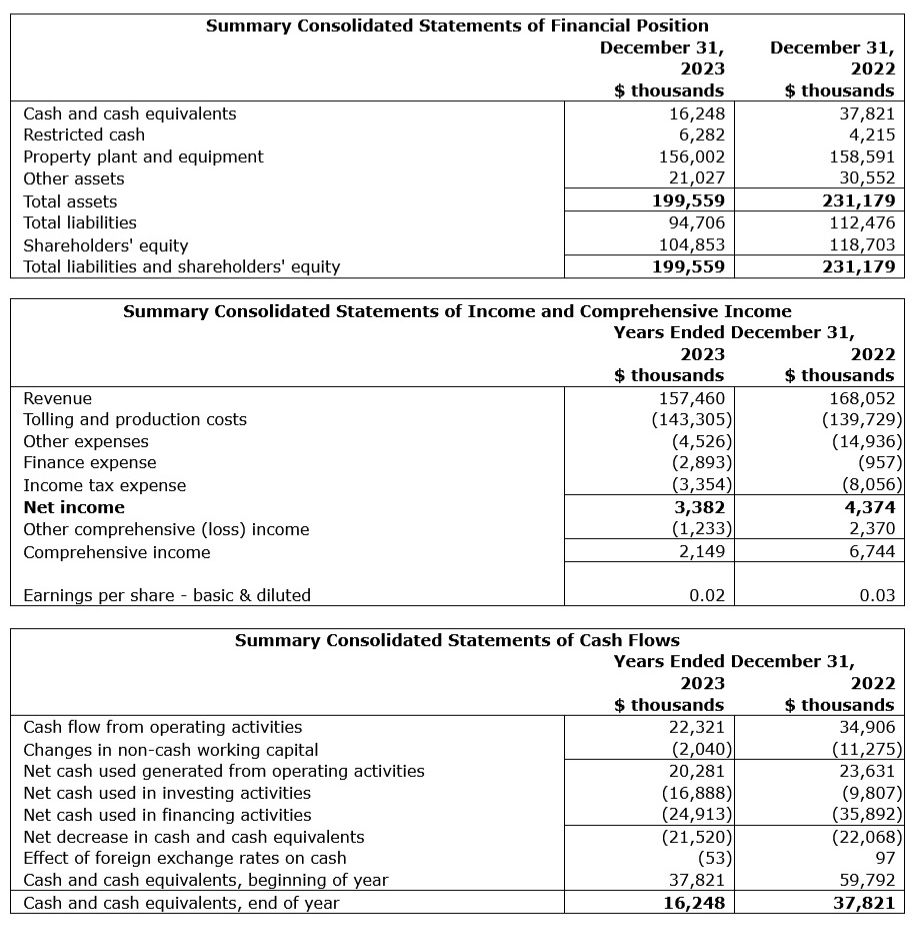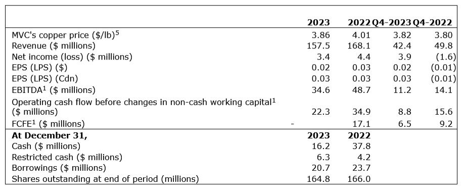 Notwithstanding the negative production impact, the Company posted 2023 net income of $3.4 million (2022: $4.4 million) and annual EPS of $0.02 (Cdn$0.03) (2022: $0.03 (Cdn$0.03)).
