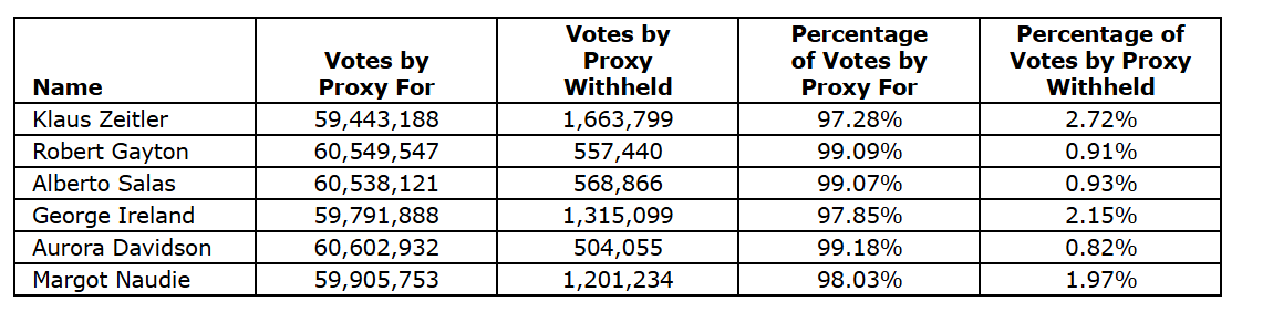 A total of 68,548,449 common shares were voted at the AGM, representing 41.7 per cent of the votes attached to all outstanding common shares of the company. Shareholders voted in favour of all items of business before the AGM, including the election of all director nominees (see an attached table).