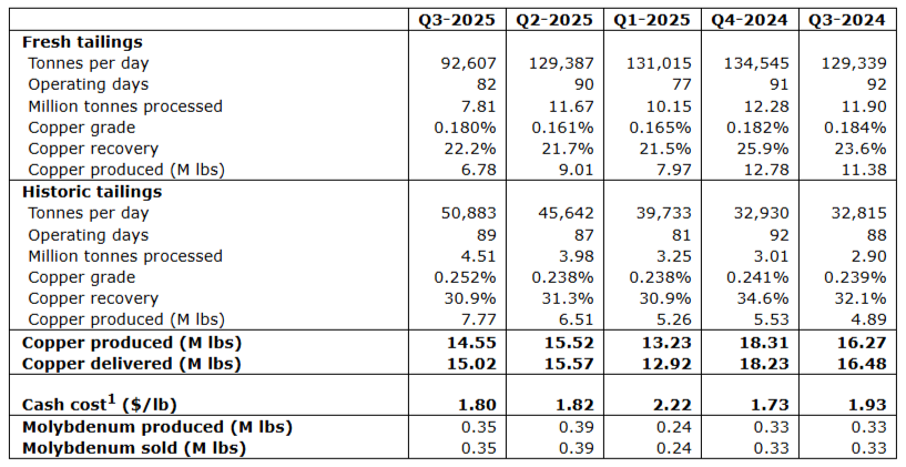 Operational results during Q3 2025 were impacted by lower fresh tailings throughput following an accident at the El Teniente mine, as reported in the company's news releases of Aug. 6 and Aug. 13, 2025. MVC did not receive fresh tailings for 10 days in August while El Teniente's mine operations were fully suspended. El Teniente's operations continue to ramp up under the safe and progressive restart of operations plan, but fresh tailings throughput has not yet returned to preaccident levels. Despite this dynamic situation, MVC's daily production has remained stable since the last week of August.