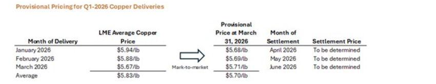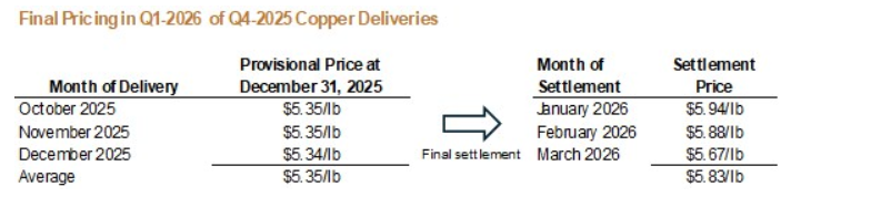 During Q1 2026, all the final price settlements for MVC's Q4 2025 copper deliveries were positive (final prices were higher than provisional prices). Q4 2025 copper deliveries had been marked to market on Dec. 31, 2025, at an average price of $5.35/lb, and were settled at the LME average monthly copper prices for January, February and March, 2026, as shown in the attached table.