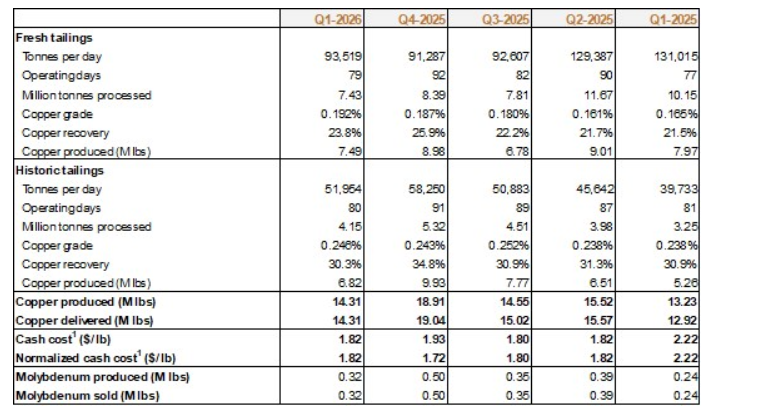 - Q1 2026 copper production of 14.3-million pounds; maintenance shutdown complete;