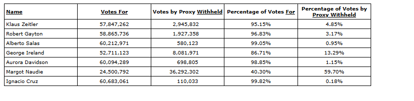 The company understands that Ms. Naudie did not receive a majority of votes in favour of her election due to one of the proxy advisory firms having recommended a vote to withhold on Ms. Naudie's election due to perceived overboarding, based on the criteria used by that proxy advisory firm. The views of shareholders are important to the company's board of directors, and the chair may engage with shareholders who voted to withhold on Ms. Naudie's election and consider any feedback received.